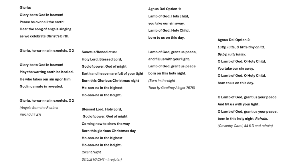 I wrote this years ago – partly inspired by the fact that you can never fit everyone’s favourite Christmas Carols into one service – and many folk may only come to one service as part of their Christmas celebrations. Also my experience was choristers saying “of course we’ll be at the midnight service Rachel, what do you take us for?” – and then having no-one there to sing the choral music I had set expecting there to be a choir. I needed anyone coming in to be able to enthusiastically join in the whole service – including the mass setting.