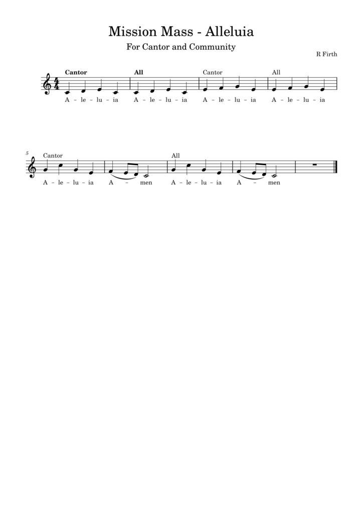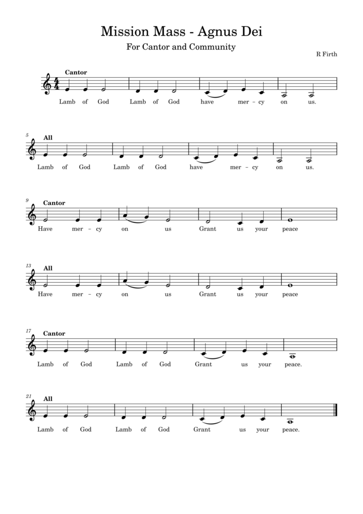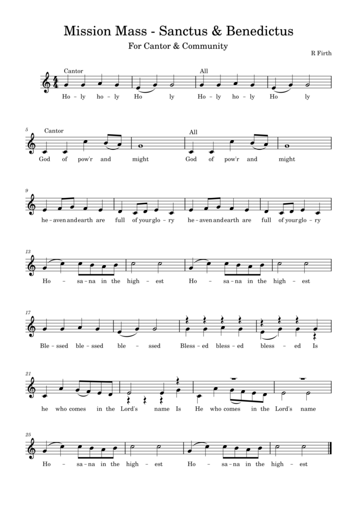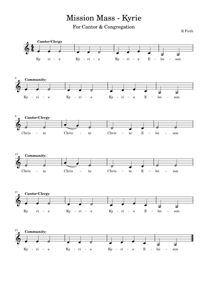 This little bit of a Mass setting is something that can be used in any season (well it’s got some Alleluias so let’s avoid Lent, eh, but…..) I wrote these so I had something I could cantor as I presided – when used in Lent / Advent without Gloria – when used outside those seasons using a metrical / hymn tune Gloria. I called it a “Mission” Mass because I believe the liturgy is beautiful and draws people closer to God – and that being able to easily participate in a sung liturgy makes that connection more immediate for anyone coming into church who doesn’t have any kind of previous experience with it. We could get into a long conversation about people singing anything in public however easy it is to do so, and cultural change – but not today. Just thinking as I upload that it could do with a “memorial acclamation”.